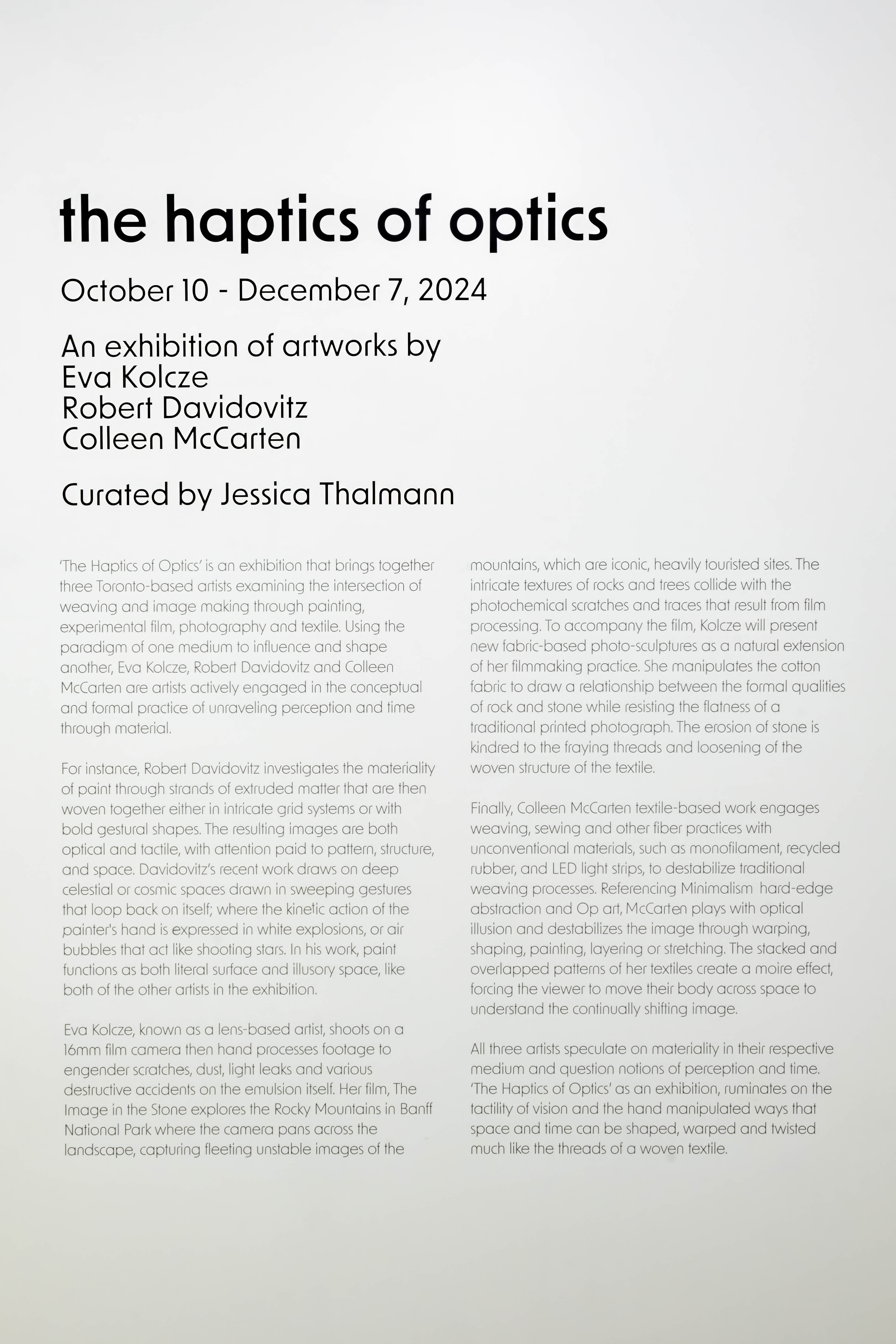 An exhibition of artworks by Eva Kolcze, Robert Davidovitz, and Colleen McCarten, curated by Jessica Thalmann